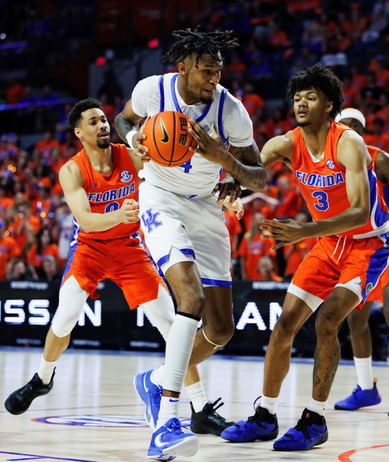 Daimion Collins (#4) is double-teamed by Myreon Jones (#0) and Alex Fudge (#3)
