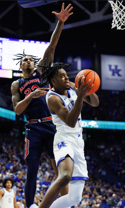 Oscar Tshiebwe is on the floor fighting Auburn's Johni Broome for the ball