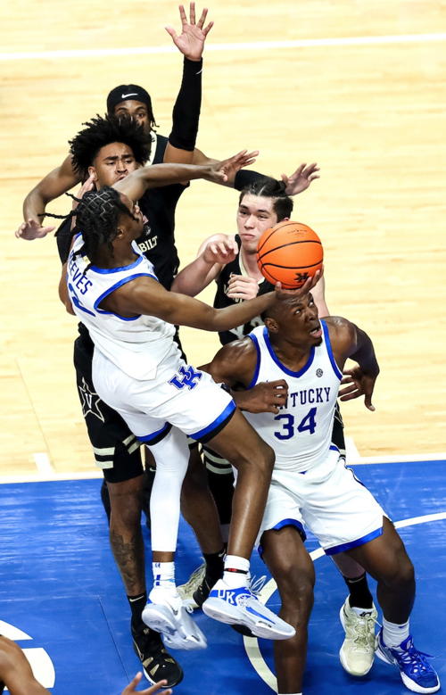 Oscar Tshiebwe (#34) secures a rebound while Vanderbilt's Quentin Millora-Brown (#42) looks on