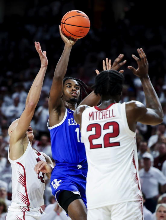 Antonio Reeves shoots between Arkansas' Makhel Mitchell (#22) and Jordan Walsh