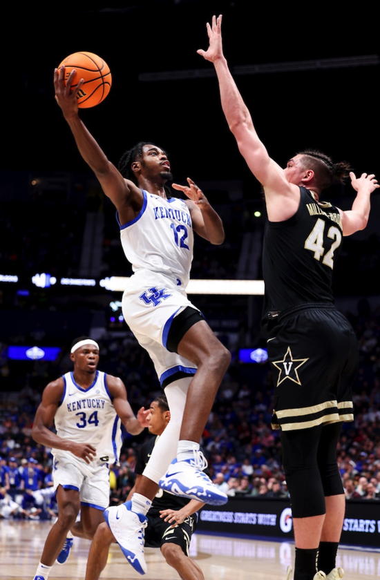 Antonio Reeves (#12) drives against Quentin Millora-Brown (#42)