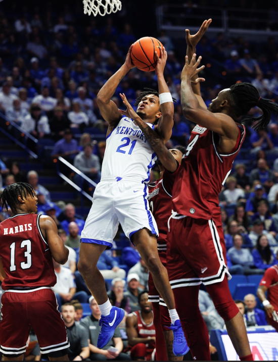 Tre Mitchell (#4) jumps off against New Mexico State's Kaosi Ezeagu (#1) to kick off Kentucky's basketball season