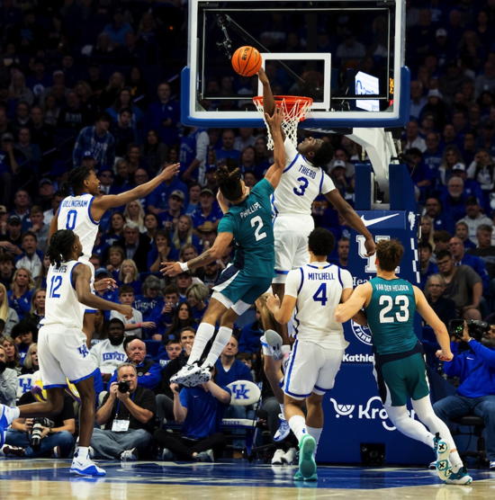 Adou Thiero (#3) blocks the shot of UNC-Wilmington's Shykeim Phillips (#2)