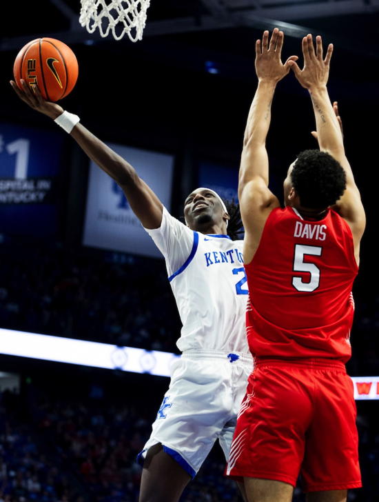 Aaron Bradshaw (#2) reaches to shoot around the defense of ISU's Jordan Davis (#5)