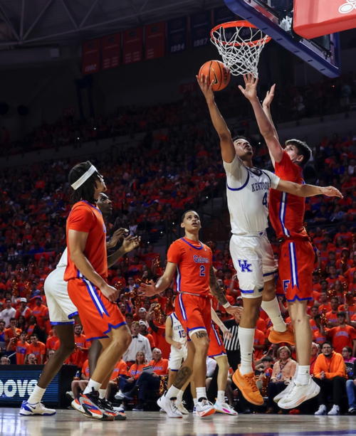 Aaron Bradshaw (#2) shoots the go-ahead three-pointer late in the game over Florida's Micah Handlogten (#3)