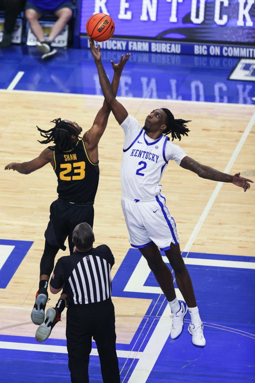 Aaron Bradshaw (#2) tips off against against Missouri's Aidan Shaw (#23)