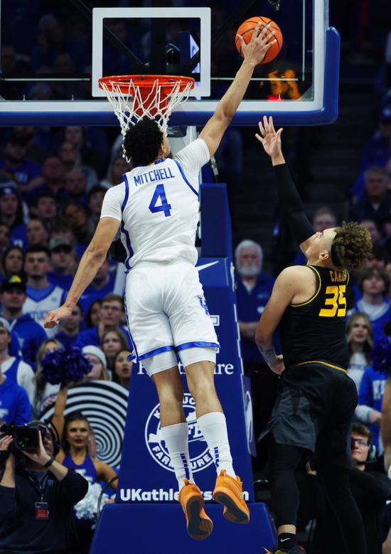 Tre Mitchell (#4) blocks a shot by Mizzou's Noah Carter