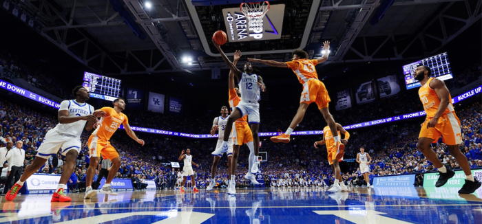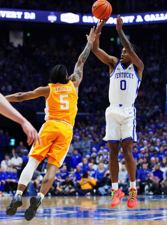 Rob Dillingham (#0) shoots over Tennessee's Zakai Zeigler (#5)