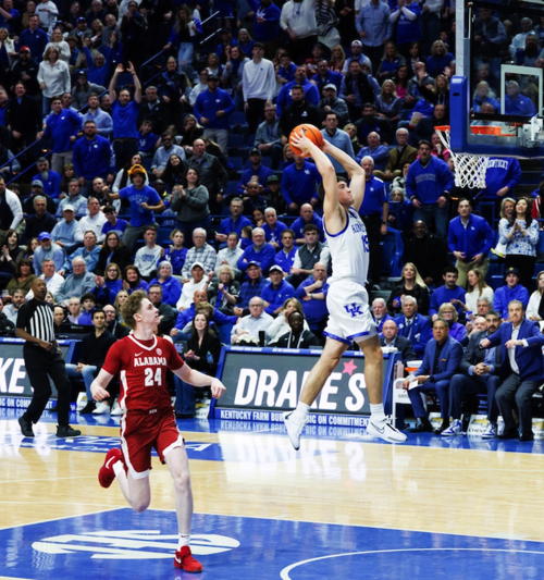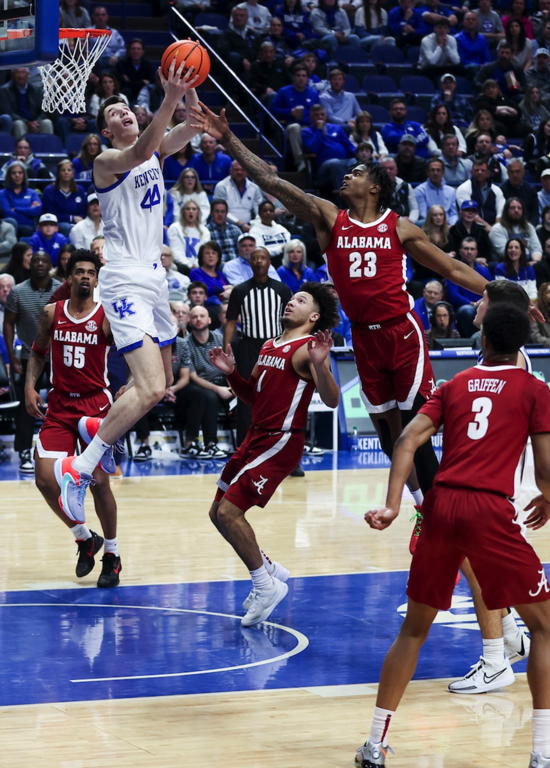 Justin Edwards (#1) extends for one of his 10 field goals over Alabama's Nick Pringle (#23)