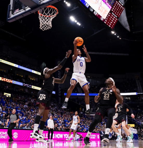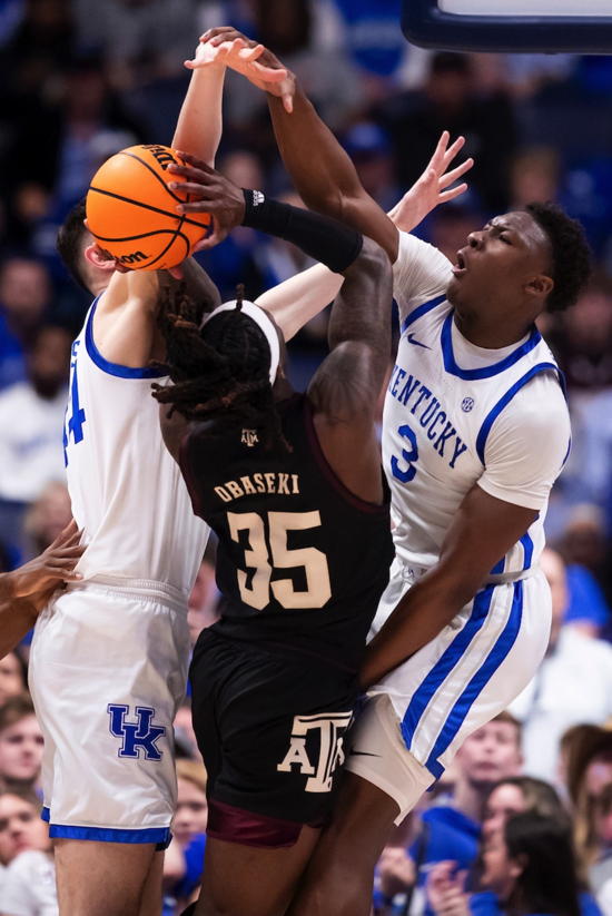 Adou Thiero (#3) and Zvonimir Ivisic defend against Texas A&M's Manny Obaseki (#35)