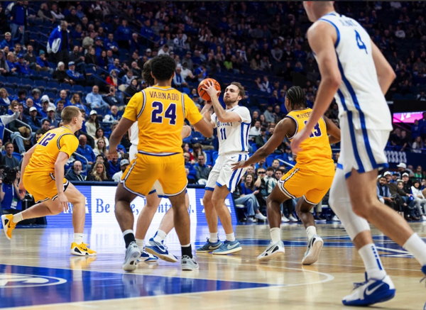Walker Horn (#11) prepares to score his first points in his Kentucky career by launching a three-pointer as the shot clock was about to expire
