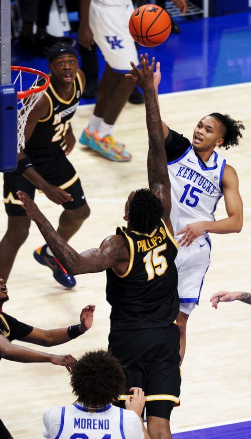 Jaland Lowe (#15) floats a shot over Missouri's Shawn Phillips (#15)