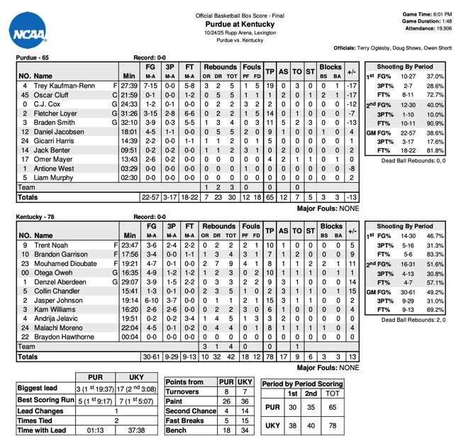 | 10/24/2025 | Purdue at Kentucky | W | 78-65 | Exhibition |