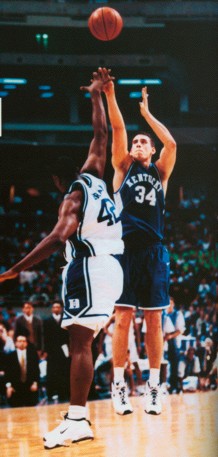 Sean Woods - Woods drove down the side of the key and banked in this 10-foot floater over the outstretched hands of the taller Duke players to give UK the lead with 2.9 seconds left in overtime. This game, against the number one rated and defending champion Blue Devils is considered one of the most exciting and best played NCAA tournament games in history.