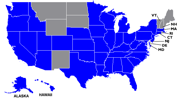 | Alabama | Alaska | Arizona | Arkansas | California | Colorado | Connecticut | District of Columbia | Florida | Georgia | Hawaii | Illinois | Indiana | Iowa | Kansas | Kentucky | Louisiana | Maryland | Massachusetts | Michigan | Minnesota | Mississippi | Missouri | Nebraska | Nevada | New Jersey | New York | North Carolina | Ohio | Oklahoma | Oregon | Pennsylvania | South Carolina | Tennessee | Texas | Utah | Virginia | Washington | West Virginia | Wisconsin |