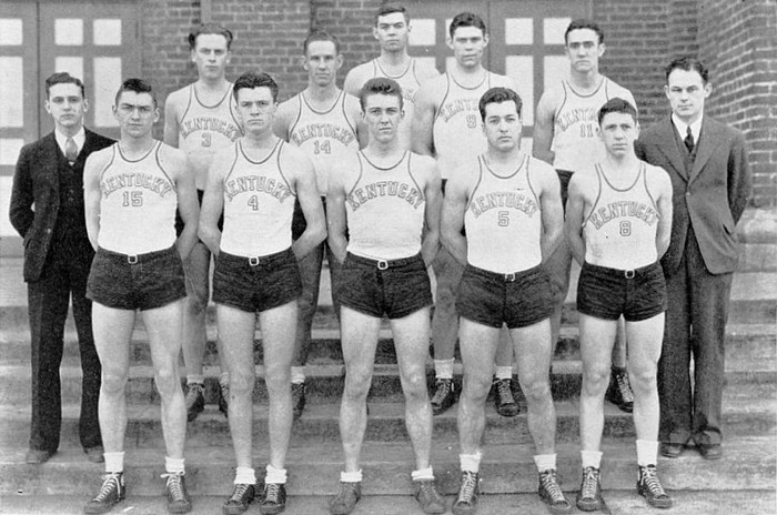 The first intercollegiate game of the year was against the Georgetown Tigers. They put up a stiff fight against Kentucky in the first half but the Big Blue soon found the weaknesses and warming to their task easily routed the Bengals. Coach Carey Spicer, former Big Blue star athlete, could not compete against Coach Rupp's Big Blue.