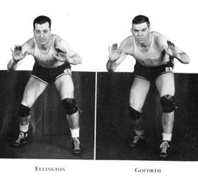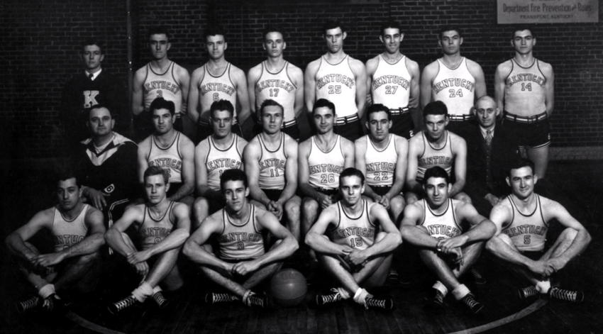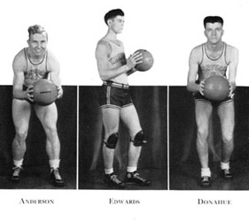 With this suicide assignment in front of him. Coach Rupp laid his plans of attack and built a team that scored more than 1,000 points, and from which two All-Americans were chosen -- Dave Lawrence, forward, and "Big Ed" Edwards, center. This great quintet was built around a nucleus of Lawrence and Tucker, co-captains and two forwards who were playing their last season of college competition. The three other men he gathered into the regular fold were Warfield Donahue, sophomore guard, Millard "Andy" Anderson, junior guard, and, of course, the 6-feet 4-inch LeRoy Edwards, for the pivot position.