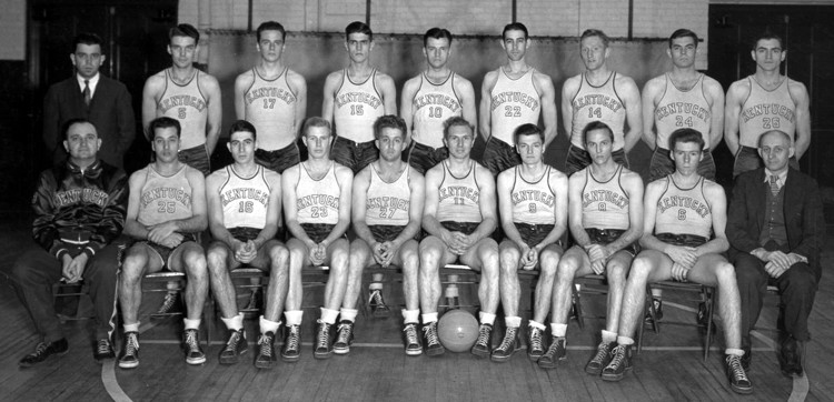 Seated (l to r): Head Coach Adolph Rupp, Russell Ellington, Robert Taylor, Bruce Davis, Red Craig, Milerd "Andy" Anderson, William Spicer, Charles Combs, William Davis, Trainer Mann |