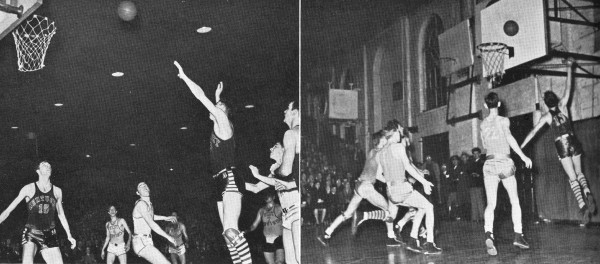 | .. . . Big Jim King goes up to drop the ball in the hoop as the Big Blue takes Maryville in stride . . . | . . . Mel Brewer goes after the tip-off in the Kentucky-Notre Dame classic in the Armory at Louisville . . . |
