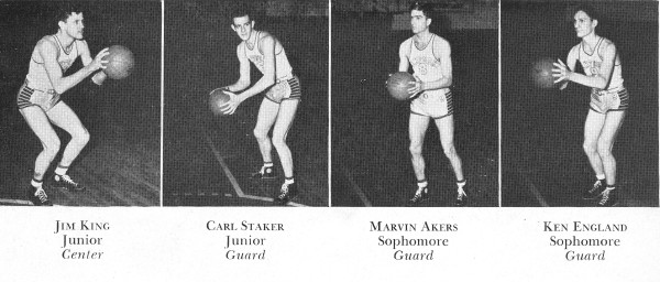 The following men made varsity "K's" in basketball: Lee Huber, Carl Staker, Marvin Akers, Keith Farnsley, Milton Ticco, Jim King, Lloyd Ramsey, Kenneth England, Ermal Allen, Mel Brewer, Waller White and Managers Garret Fitzpatrick and Bud Wilson.