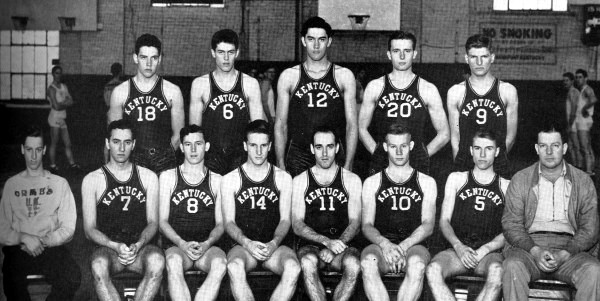 Front Row (l to r): Asst. Coach Paul McBrayer, Louis Robertson, Waller White, Keith Farnsley, Lee Huber, Lloyd Ramsey , Milt Ticco, Ermal Allen, Head Coach Adolph Rupp |