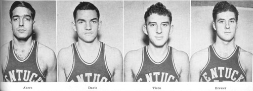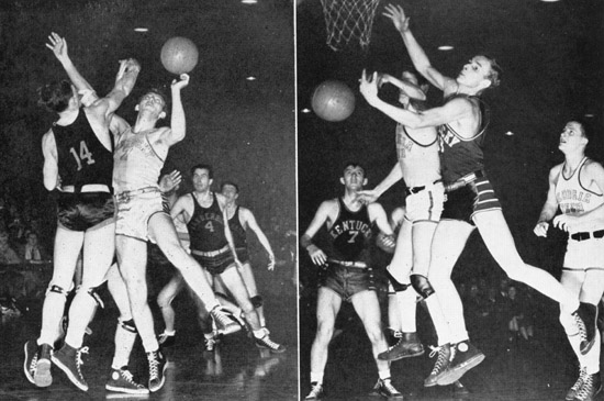 Only in the first few minutes of the fray did Vandy ever hold a lead, for the 'Cat combine went in front after five minutes and stayed there. Rebounding played a large part in Kentucky's success, as Mel Brewer drew the crowd's plaudits with his stellar floor work. The 'Cats executed many set plays in the contest while Vandy cashed in on fast breaks. Brewer and Davis led the affair with 12 points per man. Ticco and Rollins came next in order with 11 and 10. For the losers, Olsen racked up 18 markers and little Scobey followed with 10.