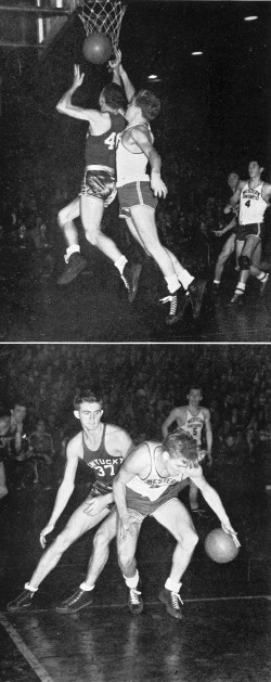 Jack Tingle, captain of the 1944-45 team, is again first string forward. Jack Parkinson, newly elected captain, is one of the starting guards, and ranks high on the list of high scorers for the Southeastern Conference. Newcomer Wallace (Wah-Wah) Jones has taken over the center position. Jones, who hails from Harlan, was proclaimed the greatest player of American high school basketball and also established a record by scoring 2,398 points in four years of high school participation. Wilbur Schu, Tingle's running mate, is one of the best rebound artists in the nation. Schu won letters in 1943, 44 and 45 for basketball at Kentucky. At the other guard position is newcomer Ralph Beard from Male High School at Louisville. Beard, like Jones, was placed on the All-State team during his junior and senior years at high school. Beard has proved to be one of the fastest men to ever hit the UK court. He is well known as a "ball stealer" and has also proved to be an excellent floor shot.