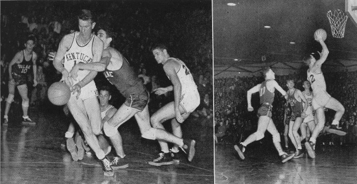 Yet you can better understand the feeling that the Wildcats engendered in the hearts of all non-Kentuckians during that tournament when you look at the scores. Col. Rupp's "pore lil' country boys" edged out Vanderbilt in the first round, 98-29; barely beat Auburn in the semi-final, 84-14, and virtually had the blind staggers in nosing out Georgia Tech in the final, 75-53.