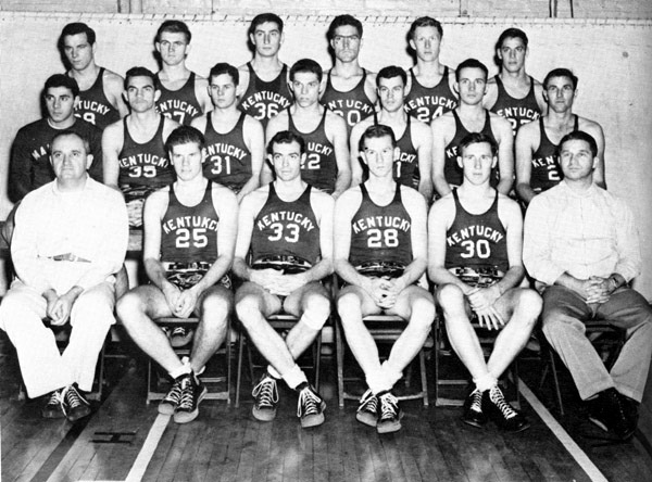 Front Row (l to r): Head Coach Adolph Rupp, Jim Line, Jack Tingle, Dale Barnstable, James Jordan, Assistant Coach Harry Lancaster |