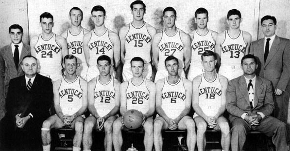 Front Row: (l to r): Head Coach Adolph Rupp, Johnny Stough, Ralph Beard, Kenneth Rollins, Cliff Barker, Dale Barnstable, Assistant Coach Harry Lancaster |