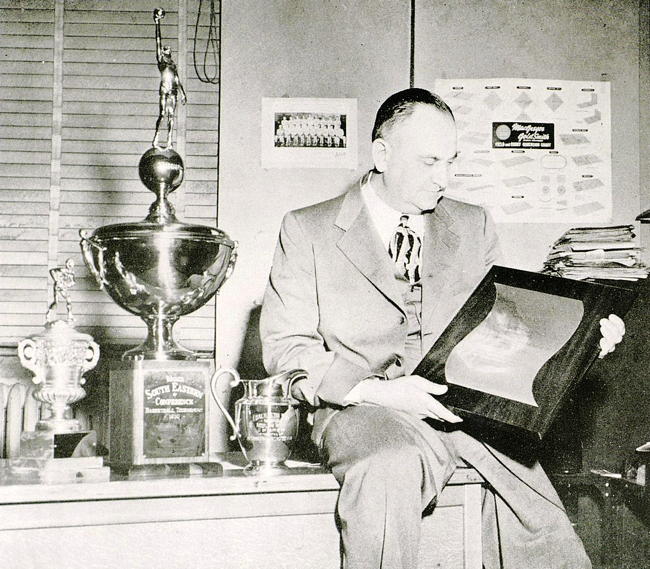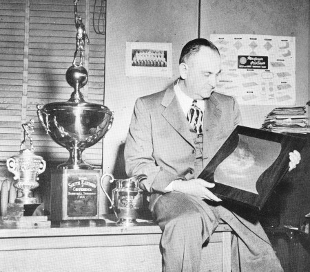 Those trophies (above) are his 1950 collection, including coach of the year and an award from the Sugar Bowl Committee for his outstanding contribution to their basketball tournament.
