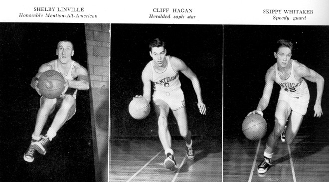 Shelby Linville had the honor of making the first Kentucky goal, a side shot after 40 seconds had elapsed in the game. Bill Spivey's 18 points vanned the Cat attack.