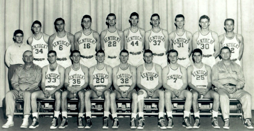 Front Row (l to r): Head Coach Adolph Rupp, Linville Puckett, Jess Curry, Gayle Rose, Clay Evans, Willie Rouse, Dan Chandler, Pete Grigsby, Assistant Coach Harry Lancaster |