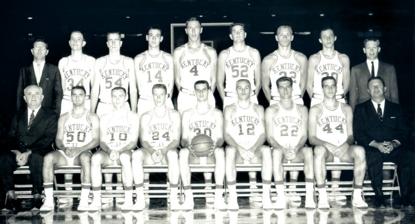 Front Row (l to r): Coach Adolph Rupp, Dick Parsons, Eddie Mason, Larry Pursiful, Bennie Coffman, Al Robinson, Sid Cohen, Bill Lickert and Assistant Coach Harry Lancaster |