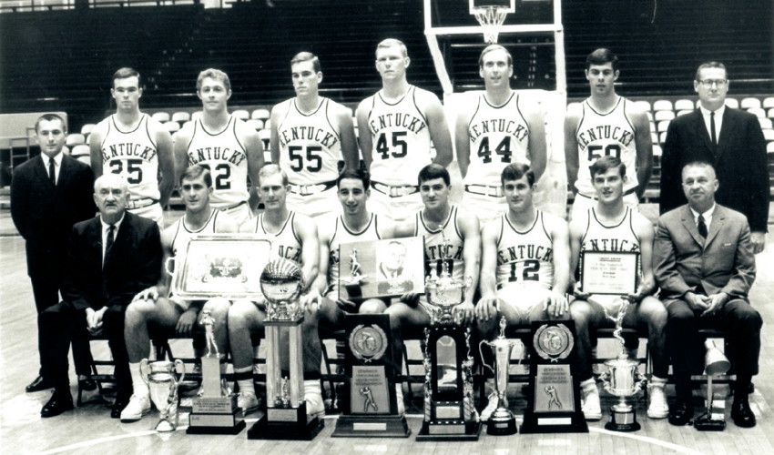 Sitting (l to r): Head Coach Adolph Rupp, Pat Riley, Bob Tallent, Phil Argento, Louie Dampier, Jim LeMaster, Steve Clevenger, Assistant Coach Harry Lancaster |