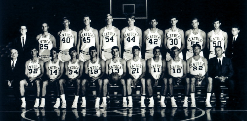 Front Row (l to r): Head Coach Adolph Rupp, Steve Clevenger, Bill Busey, Mike Casey, Jim LeMaster, Phil Argento, Terry Mills, Benny Spears, Jim Dinwiddie, Mike Pratt, Assistant Coach Harry Lancaster |