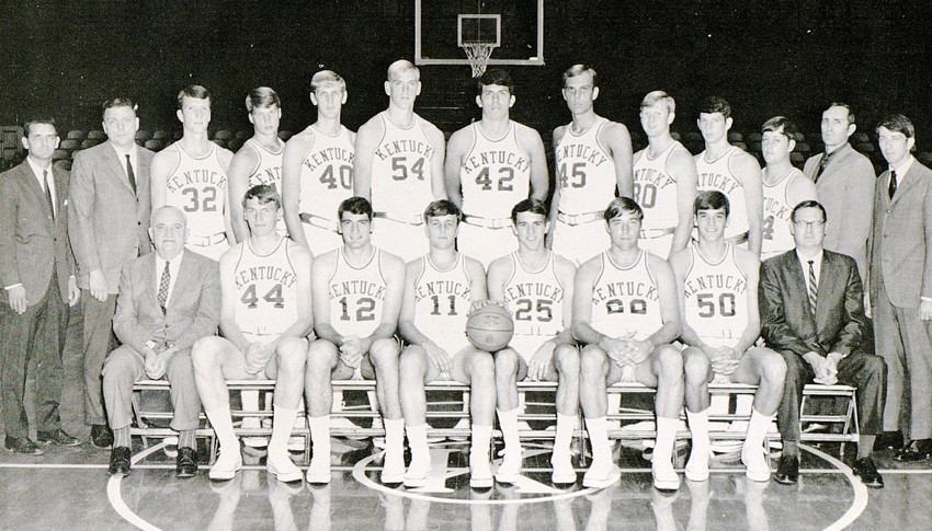 Seated (l to r): Head Coach Adolph Rupp, Dan Issel, Tom Parker, Bob McCowan, Larry Steele, Mike Pratt, Randy Noll, Assistant Coach Joe B. Hall |