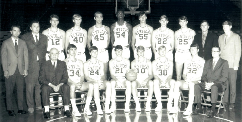 Seated (l to r): Head Coach Adolph Rupp, Mike Casey, Steve Penhorwood, Terry Mills, Jim Dinwiddie, Stan Key, Kent Hollenbeck, Assistant Coach Joe Hall. |