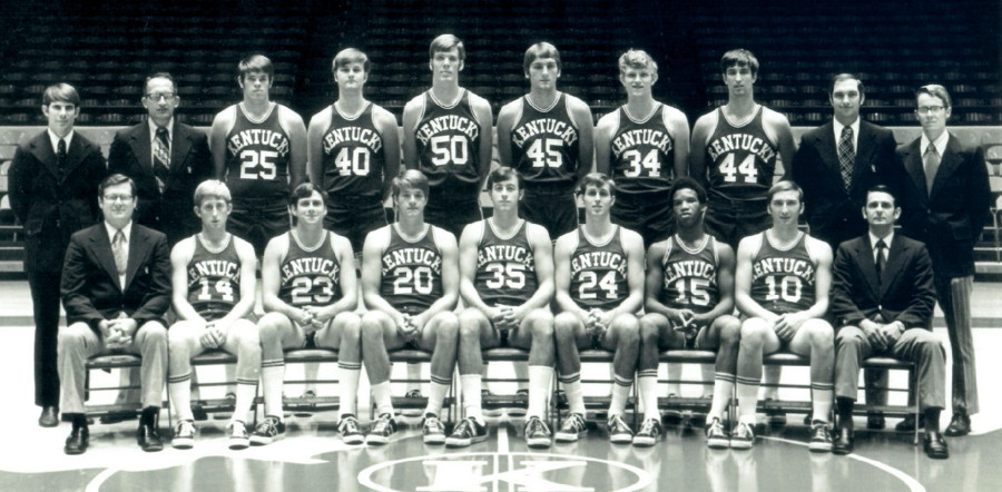 Front Row (l to r): Coach Joe B. Hall, Ronnie Lyons, Jerry Hale, Jimmy Dan Conner, Kevin Grevey, Mike Flynn, Reggie Warford, Ray Edelman, Asst. Coach Dick Parsons. |
