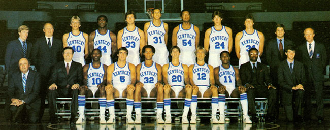 Seated (l to r): Equipment Manager Bill Keightley, Coach Joe B. Hall, Dirk Minniefield, Mike Ballenger, Derrick Hord, Jim Master, Bo Lanter, Dicky Beal, Associate Coach Leonard Hamilton, Student Manager Roger Thomas |