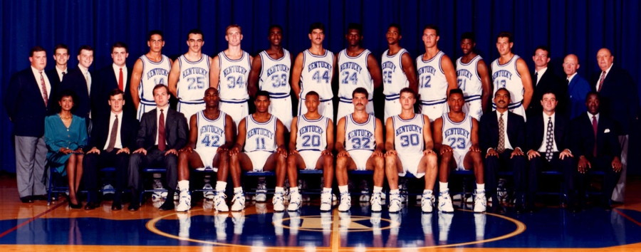 Front Row (l to r): Assistant Coach Bernadette Locke, Assistant Coach Billy Donovan, Assistant Coach Herb Sendek, Carlos Toomer, Sean Woods, Tony Cooper, Richie Farmer, Michael Parks, Nehemiah Braddy, Associate Coach Tubby Smith, Head Coach Rick Pitino, Strength and Conditioning Coach Ray "Rock" Oliver |