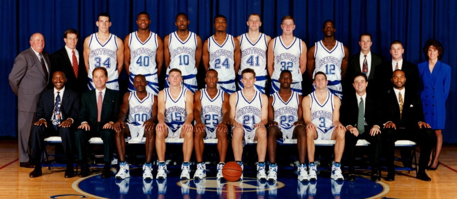 Front Row (l to r): Asst. Coach Delray Brooks, Assoc. Coach Jim O'Brien, Tony Delk, Jeff Sheppard, Anthony Epps, Cameron Mills, Allen Edwards, Chris Harrison, Head Coach Rick Pitino, Asst.Coach Winston Bennett |