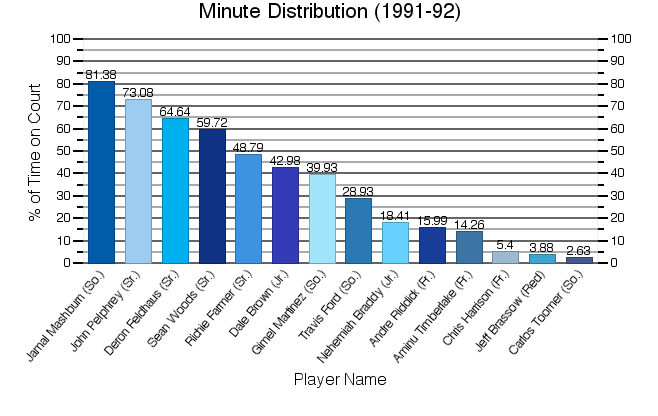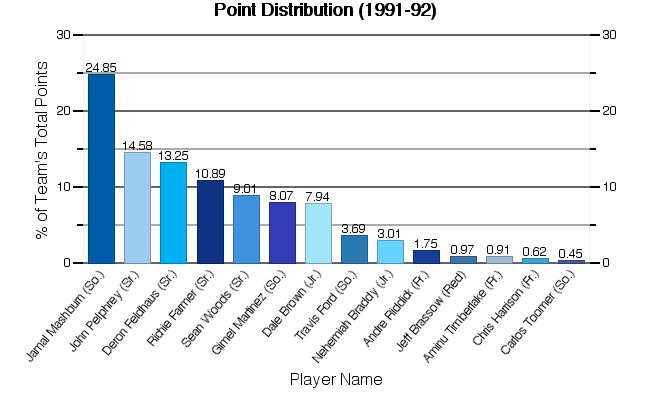 | Jamal Mashburn | 36 | 1176 | 279 | 492 | 56.71 | 58 | 132 | 43.94 | 151 | 213 | 70.89 | 179 | 102 | 281 | 52 | 65 | 23 | 123 | 84 | 767 | 21.31 |