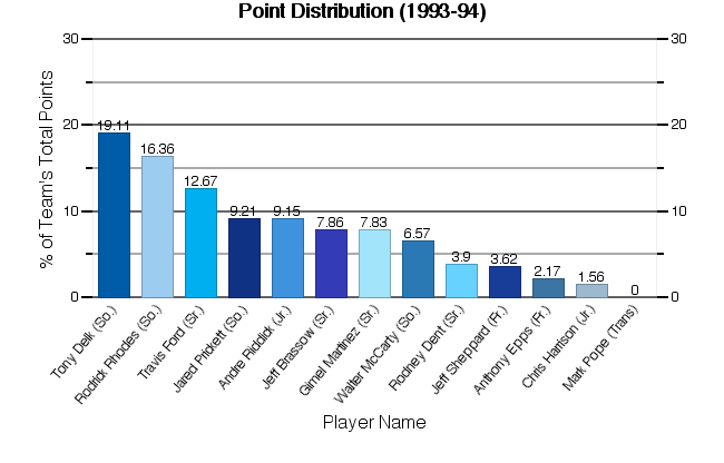 | Tony Delk | 34 | 970 | 200 | 440 | 45.45 | 95 | 254 | 37.4 | 69 | 108 | 63.89 | 111 | 42 | 153 | 59 | 64 | 21 | 70 | 59 | 564 | 16.59 |