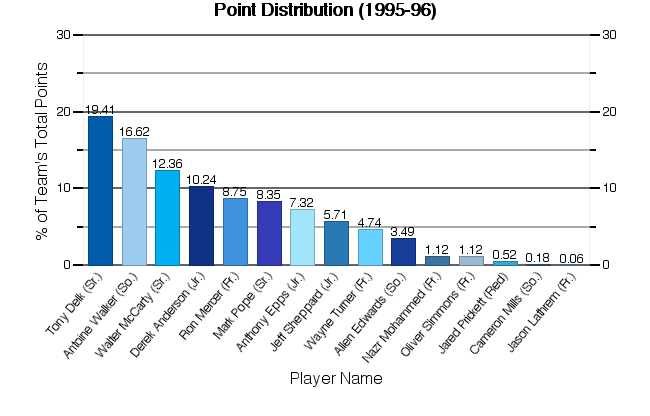 | Tony Delk | 36 | 947 | 229 | 464 | 49.35 | 93 | 210 | 44.29 | 88 | 110 | 80 | 97 | 53 | 150 | 64 | 67 | 13 | 72 | 64 | 639 | 17.75 |