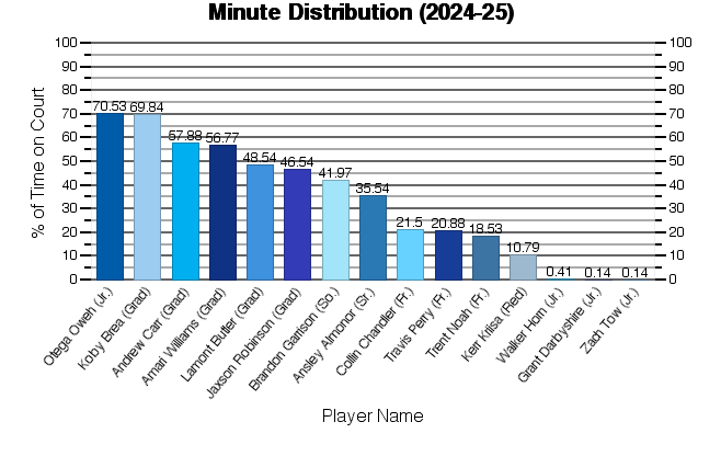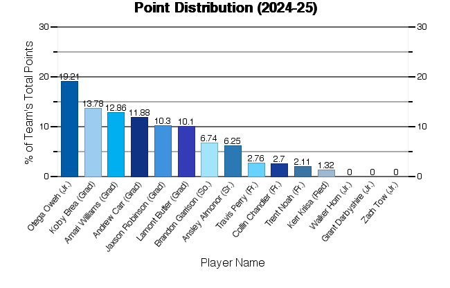 | Lamont Butler | 27 | 702 | 104 | 208 | 50 | 27 | 69 | 39.13 | 72 | 98 | 73.47 | 55 | 21 | 76 | 115 | 41 | 6 | 68 | 54 | 307 | 11.37 |