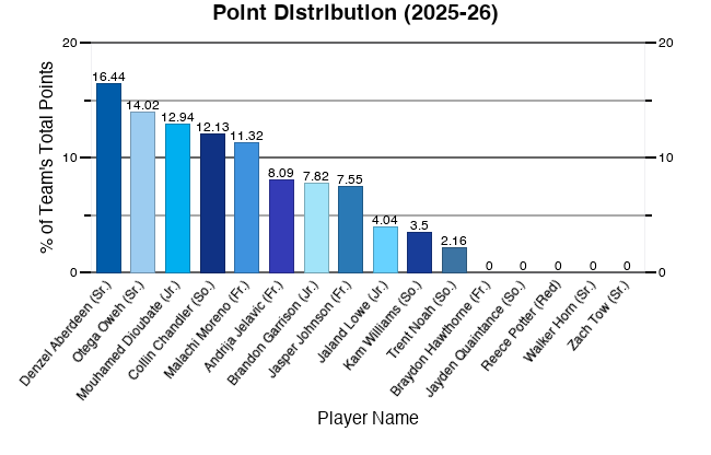 | Otega Oweh | 4 | 89 | 18 | 39 | 46.15 | 3 | 12 | 25 | 13 | 56 | 23.21 | 12 | 3 | 15 | 8 | 3 | 1 | 8 | 10 | 52 | 13 |