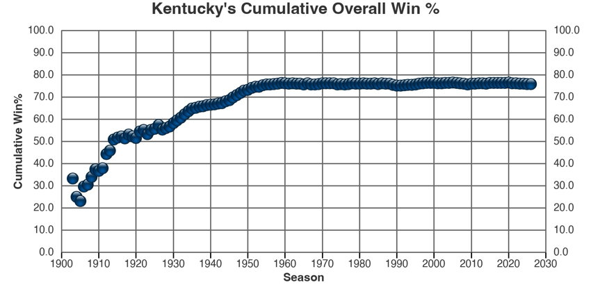 | 1966-67 | 13 | 13 | 0 | 50 | 967 | 311 | 1 | 75.61 | Adolph Rupp | Harry Lancaster, Joe B. Hall | Unranked by AP | - | Adolph Rupp's Worst Season |