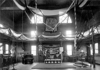 This photo shows the inside of the old Boyle Humphrey gymnasium. The small stage and what looks to be a piano in the photo underscores the multi-purpose nature of the facility.