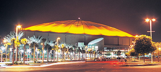 Tropicana Field (aka Thunderdome) in St. Petersburg FL is one of the more interesting domes architecturally, as it resembles a partially eaten orange.